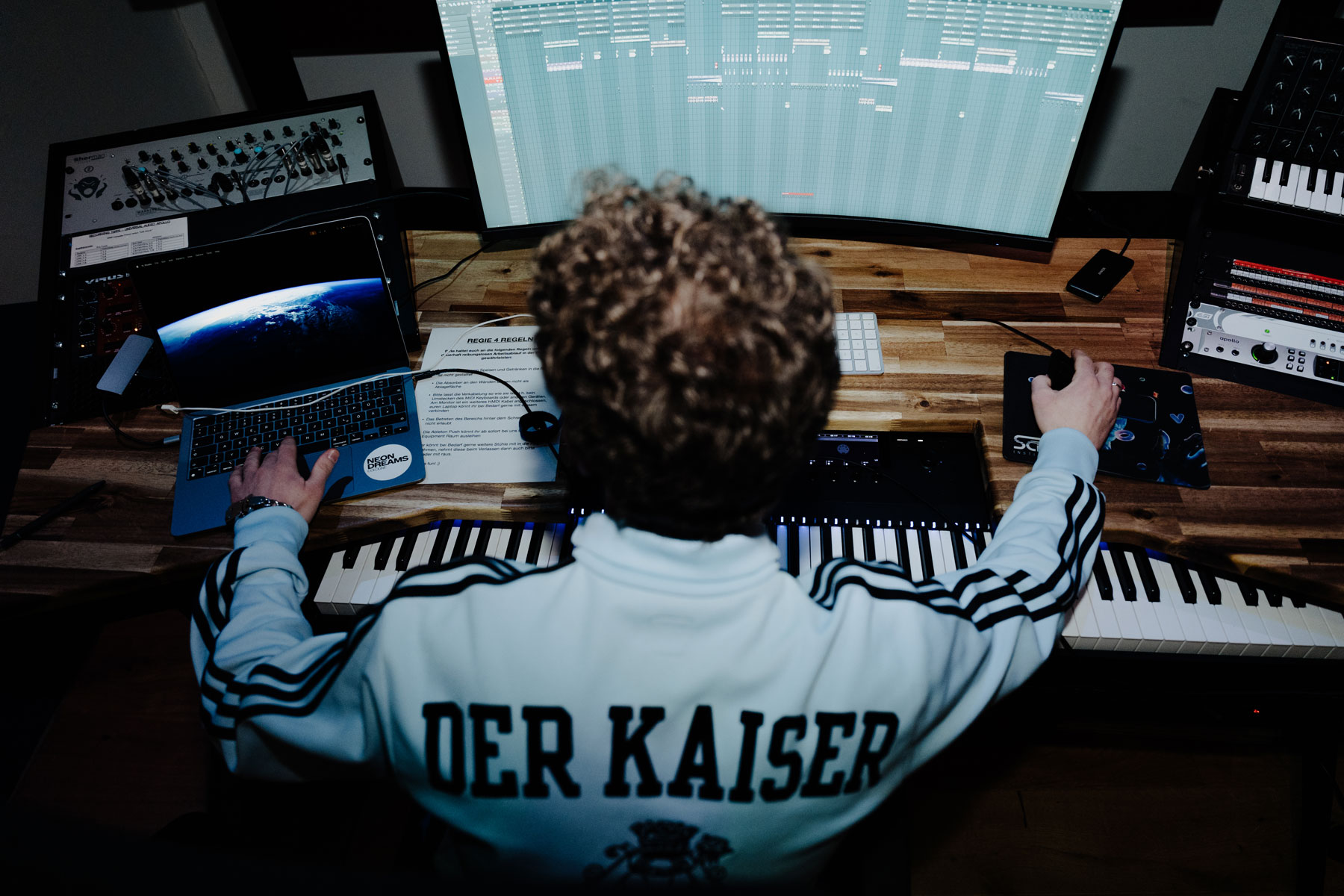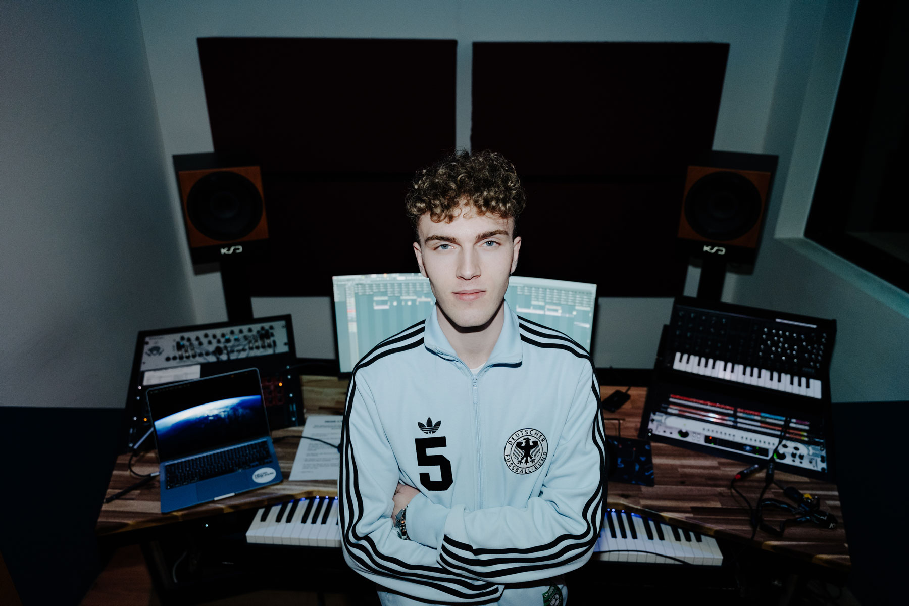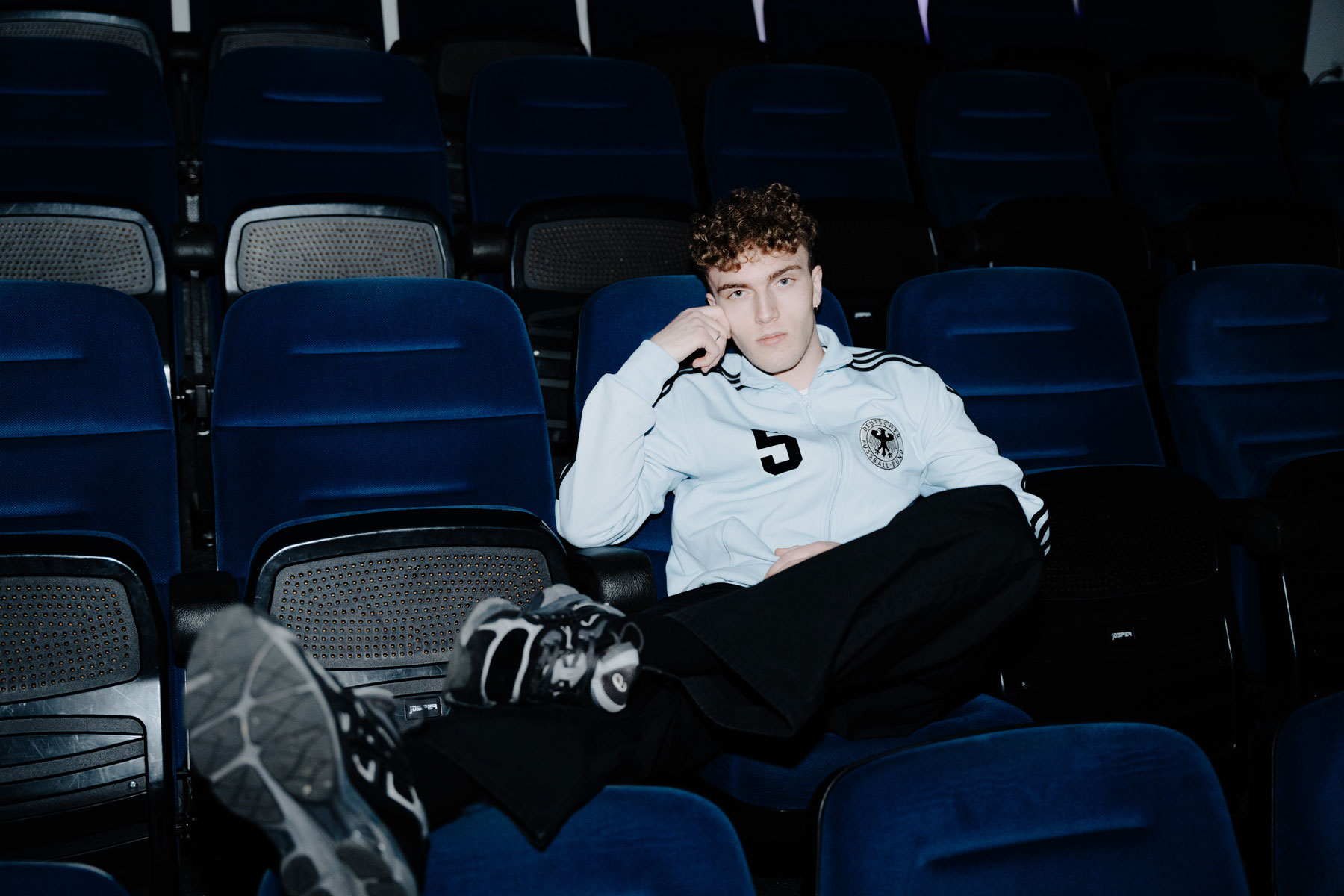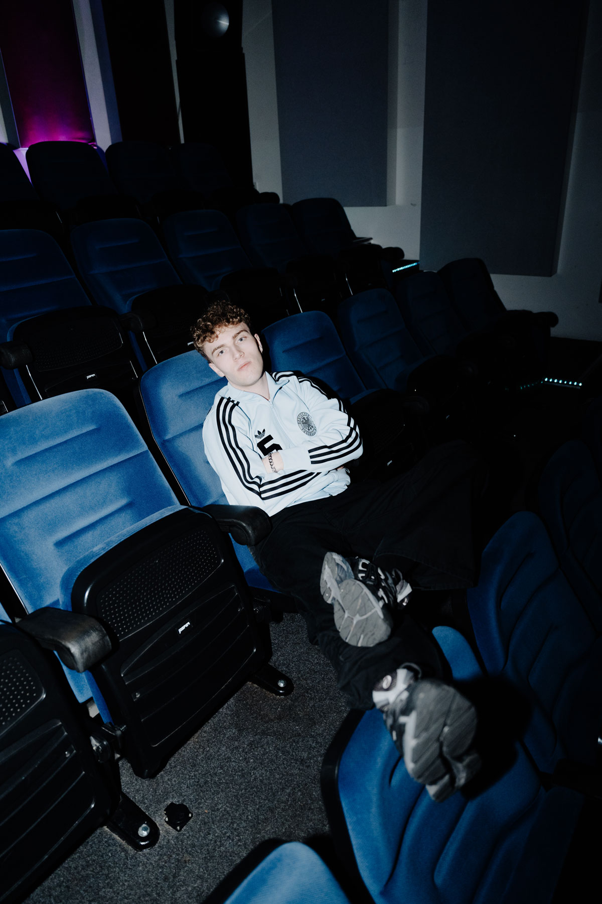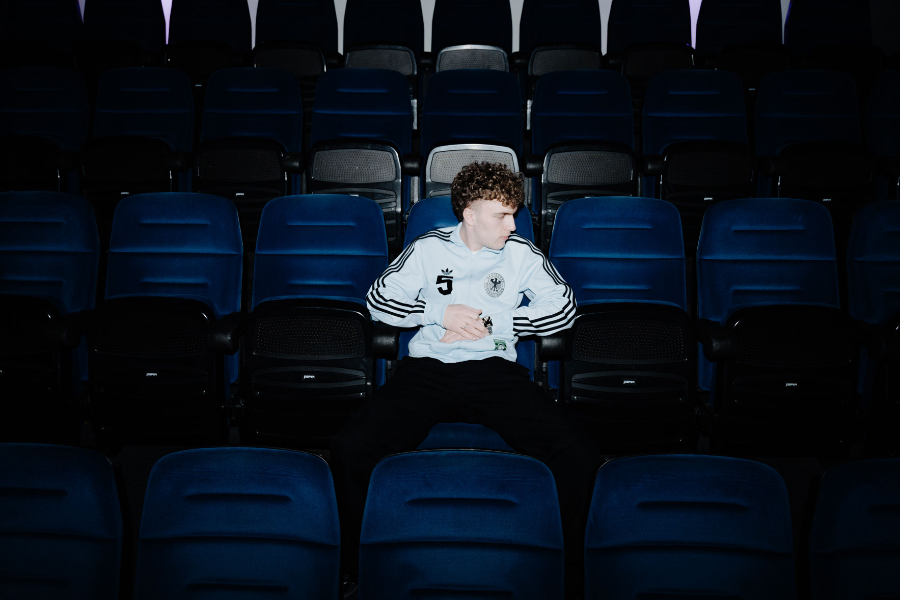 The shoot was built around two sides of the artist's identity. The first setting placed TMR inside an empty cinema auditorium, using the repetition of the blue seats and the depth of the space to build strong visual compositions. The environment brings a sense of isolation and focus, with the artist clearly at the center of everything. The second setting moved into a music production studio, putting the technical side of his work into the frame. Screens, synthesizers and production equipment give context to the process behind the music. Together, the two settings present TMR as both performer and producer, reflecting something that sits at the core of what electronic music artists actually do.